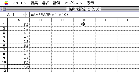 平均値の出し方は、「=AVERAGE( )」。 ( )の中に、データの範囲を指定する。