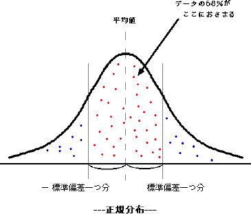 正規分布では、全ての度数の68%が、平均値から標準偏差±一つ分の間におさまる性質があります。