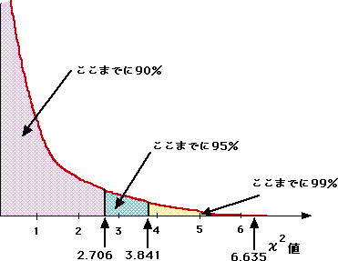 これを、全体の面積の90%、95%、99%に分割するように値をとると、それぞれ2.706、3.841、6.635になる、というわけです。