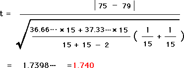 自由度=(15-1)+(15-1)=28 になり、t分布表は「自由度28」のところを見ればよいわけです。