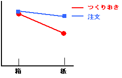 つまり、「箱」であれば「つくりおき」でも「注文」でもそんなに変わらず、「紙」であれば、断然「注文」の方がよい、ということが分かります。