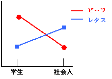 交互作用のグラフはこうなります。