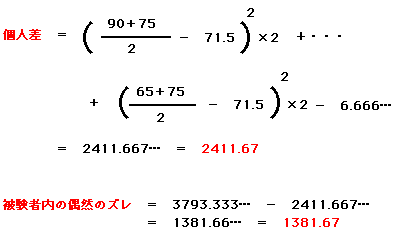 個人差を求めるときの「一人あたりのデータ数」は、今回の場合、学生・社会人それぞれ2つのデータを出しているので、データ数は 2になります。