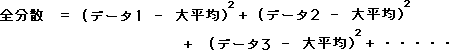 全分散は、すべてのデータについて、各データから、大平均を引いて二乗したものを合計することで求められます。