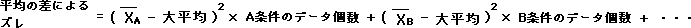 各条件の平均と大平均のズレを計算して、それに各条件のデータの個数をかけたものを合計します。