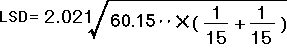 LSDを求めます。 今回のLSDに必要なt値の自由度は、分散分析表から 42 になります。 自由度が大きいので、近い値を探すと、40。 自由度40のときの、5%の値は、2.021。 偶然の差の平均平方は、60.16(60.1587…)。 LSDの公式(ここ)に当てはめて、求めます。 これを計算すると、LSD = 5.72(5.7238…) になります。 3つのデータ数は同じになるので、LSDはこれ一つを求めれば済みます。 あっていたら次の問題