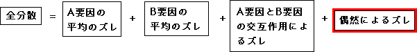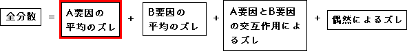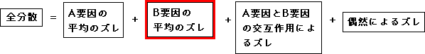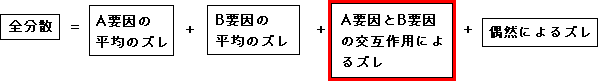A要因とB要因の交互作用によるズレは、全条件の平均のズレを計算し、これからA要因とB要因のズレを引くことで求められます。それが、それぞれ単独では説明できない、A要因とB要因がお互いが影響しあってできたズレだと考えられます。