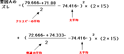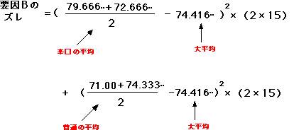 そこで、要因Aの条件内の平均と大平均とのズレを求め、データの個数倍(要因Bの種類数×全部の条件の平均データ個数)します。今の場合、要因Bが2種類あるので、データ数は2N(Nは全条件の平均データ個数=15)になります。