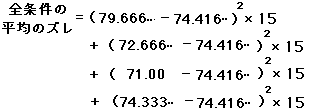 そこで、まず全条件の平均のズレを計算します。各条件の平均と大平均とのズレを計算し、データの個数倍して、足していきます。