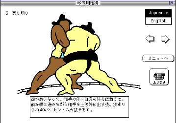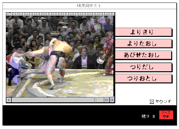 そこで打開策の一つとして自分は、『映像をつかったCAI教材』を思いついた。この教材は動画、つまり動きのある映像を取り入れることによって今までの教材に見られたパターン化を防ぐ策であると共に、CAI教材に対する新鮮さを取り戻せるのではないかと考察した。この研究の目的は相撲の決まり手をCAI教材で身に付けさせることである。相撲はスポーツの中でも特に動きが単純であるため、勝敗だけに目が向けられがちである。そこでCAI教材を使用し、相撲の決まり手を覚えることによって相撲をより詳しく、より楽しく見られるようになってもらいたいと考えこの教材を作成した。