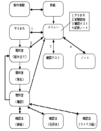 教材を設計するにあたって、始めに図1の全体構成図を作成し、それにそって描かれた紙上のスケッチに基づいてプロトタイプを作成した。