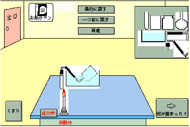 かた」では実験の流れを示すと同時に学習目標(4種類の異なる気体を発生させよう)を提示する。メインとなるのは「理科室」(図2)で、ここで気体の発生をシミュレーションする。「器具庫」をクリックすると画面に器具が表示される。その中から好きなものを選んで実験台に運び組み立てる。「くすり」ボタンは薬品名のみを表示するが、その中から液体の薬品を選択するとスポイトの絵、個体の薬品を選択するとスプーンの絵が現われる。それを実験装置に運び重ねると音によって実験装置に入ったことが認識できる。選択された薬品名は画面下に表示され、学習者がどの薬品を使用したか確認できるようになっている。「点火」ボタンをクリックするとガスバーナーは点火する。