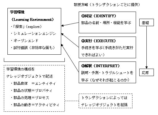 本章の概要を図示すると以下のようになる。まず、学習者が自由に探索が行える(学習目標に向かって作業を行うことができる)学習環境がある。学習環境の構造はナレッジオブジェクトの知識表現で記述されている。この学習環境は、学習ガイダンスのようなものは無く、単に自由な探索ができるものであり、何かを習得しようとしても試行錯誤を繰り返すだけで非効率的な面がある。そこで、トランザクションごとに、そのトランザクションが目的とする学習が成立するための教授方略に基づくガイダンスを学習環境に提供していくことで、効果的な学習環境にしていこうというものである。トランザクションは、同定→実行→解釈となるに従ってより高度な内容となる(つまり部品名や場所[同定]をしらないと、手続き[実行]を学習することは困難であり、手続きをただ実行できるのではなく、なぜそれが起こるかをわかるのが[解釈]となる)。