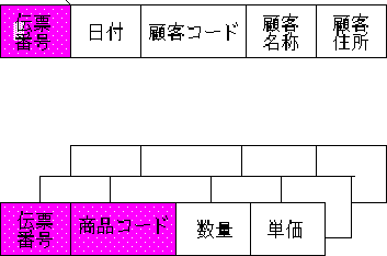 たとえば、非正規形において伝票番号が全体を通して一連番号であるとすると、伝票番号を主キーとして設定できる。以下、表の例示において、網掛け部分の属性が主キーである。そして、繰り返しを分割した各レコードは、商品コードもあわせて主キーにしないと特定できない。
