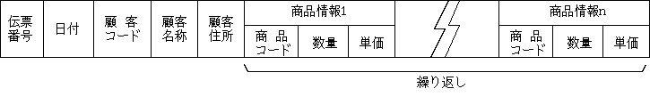 - 非正規形のレコード様式は、「商品コード、数量、単価」のグループに繰り返しがあるため、これらのレコードを複数レコードに分よう。