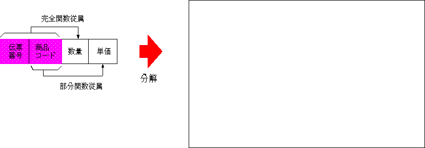 第一正規形で、かつ、主キー以外の属性が主キーに対して完全関数従属となるものを第二正規形という。第一正規形を得るときに連結キー(伝票番号+商品コード)が発生することがあり、連結キーについて部分関数従属となることがある。このとき、さらに分解して第二正規形とする必要がある。