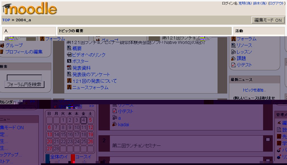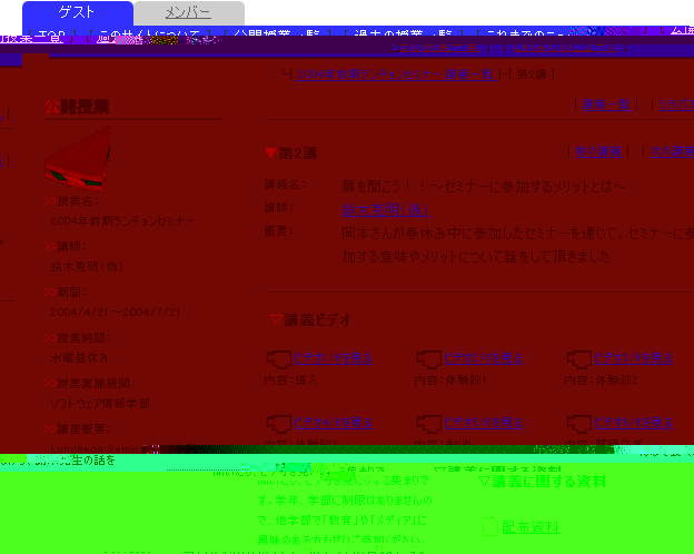 CMSの適応状況CMSが持ち合わせていない機能は、 他の機能を代用して利用することができた。 しかし、管理する側の潜在的な問題点がいくつか発見された。 exCampusの適応状況ビデオ配信のためのリンクがあるため ストリーミング動画を用いた講義に適していた。 Moodleの適応状況学習者同士の意見を交わせる機能が多かった マッチした機能はあるが講義をひとつのコースとしているため心なしか使いにくい Clarolineの適応状況HTMLを自由記述できるMySygwigエディタが利用できるため 無い機能でも記述の仕方によって何とかなる CEASの適応状況多機能なのだが講師が行う管理がわかりにくい 受講者同士のコミュニケーション機能が少ない 多機能で学習者にとってのインターフェイスは利用しやすい GSBLOGの適応状況ひとつの記事で話題提供という意味ではブログが利用しやすい 基本的にHTMLの自由記述のため簡単に修正・編集ができる XOOPSの適応状況そもそも講義をコースごとに管理していない ひとつの話題でひとつのxoopsを利用するとうまく行くような気がする 存在しない機能はモジュールを入れることにより利用できるが システム管理者の負担が多くなる SiteDev(Wiki)の適応状況コース管理よりもコラボレーションツールの意味合いが強い 利用できないことは無いがランチョンのページそのものを作成するには適している |