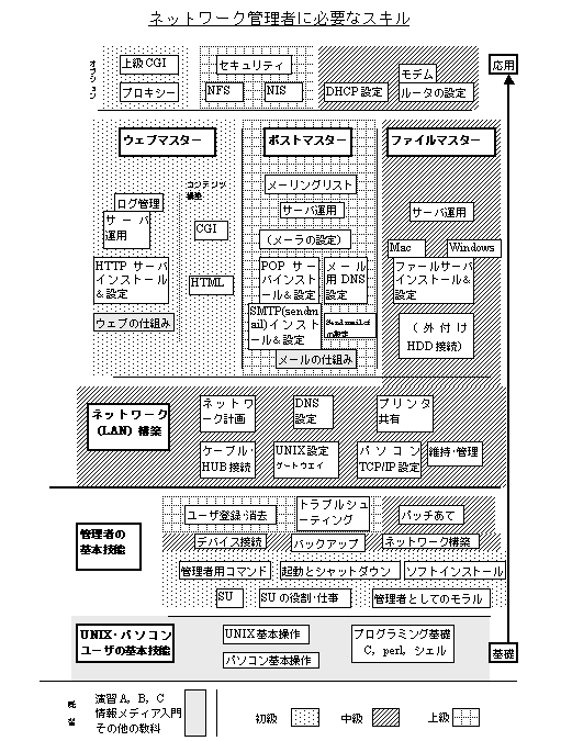| 備考 | 課題をはじめる前に、Linux管理者(見習)として認定され(ソフトウェア演習A〜C及び情報システム演習Aに合格していることが認定の条件)、使用するDOS/V機の指定を受けること 課題(3)の前に、etドメイン参加のための情報を受け取ること |