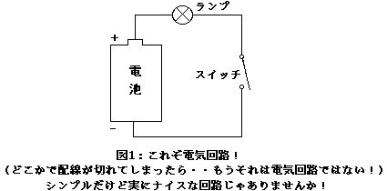 曽我氏は電気回路を「電流が環流するループ状の一連の配線」と定義している。 簡単な電気回路を下に示してみた。電流が電池の+端子を出発し,ランプやスイッチを 経由しながら-端子へと環流している。配線がどこかで切れていれば当然電流は全く 流れない。したがってそれは電気回路とは呼ばない。多少例外はあるが基本的には電気回路 はループ状でなければならないのだ。