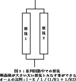 並列接続の場合でも同じ要領で考えてみると,一つにまとまった断面積の大きくて太ーい抵抗とみることができる。 オームの法則で表わすなら電流(I) = 電圧(E) / 1/抵抗(1/R1+1/R2+1/R3)となる。繁分数だが落ち着いて計算すれば 楽勝だ。