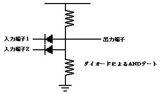 下にダイオードによるANDゲートの図を示す。論理積「AND」についてはコンピュータアーキテクチャで既に学んでいるので詳しく説明しなくても分かると思う。入力1もしくは2の片方にしか入力されなければ結果として出力されない。両方に入力があって初めて出力は論理信号1を返すのだ。