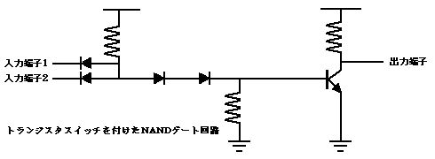 下の図はトランジスタスイッチを用いたNANDゲート回路である。「NAND」についても説明する必要はなかろう。「ANDの否定」だ。 ここのトランジスタは複数のゲートを多段手的に接続した時の出力電位の不具合を解消する為に用いられている。なお,この回路はまだまだ繁雑なので,現在ではエミッタが二つあるトランジスタを用いたNAND回路が使われている。