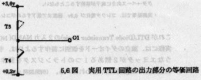 さらにTTL NAND回路の出力部分は下図のように等価な回路に置き換えて考えた方が分かりやすい。 このTTL回路の出力に他回路の入力を複数つなげると,一定の電流を維持できなくなる。10個の入力を つなぐのが正常限界とのことだ。 曽我氏はきっと「ちなみに」的な意味を込めてレジメに書いたのだろうが,このTTL回路の出力同士を 接続すると大電流によって壊れてしまうらしい。(ホントにおまけ的な話しだな,こりゃ。出力同士を 本気で接続してしまうお馬鹿さんなんているわけないよ・・・)