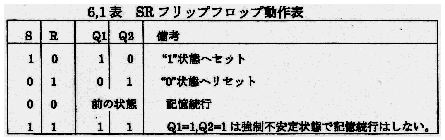 前述した双安定回路の状態を外部から自由にコントロールできるようにしたのが下図のSRFFである。さらにその下には入力S,Rに"1"または"0"を入力した時に 出力Q1,Q2がどうなるかを表にしたものを示す/p>