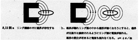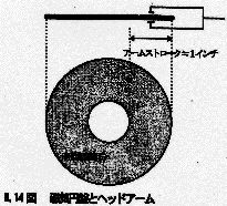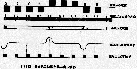 磁気媒体の表面に記憶されている情報を読み出すには下図のようなヘッドを用いる(かなりおおまかな図ではあるが。。。) 簡単に説明すると黒い固まりがヘッドの磁芯で輪のようなものが巻線だ。ヘッドの真下を次々に磁性体が通過する度にヘッドの 巻線の中を通る磁界は2つの方向のどちらかになる。磁界の方向が変化しようとする時,現在の磁界を維持しようとする向きに 巻線に電流が流れる。この電流を感知することで記録されている情報を読み取る。ところがここで問題が発生する。同じ方向の 磁区が連続したらどうなるだろう。1つの長い磁区になってしまって,出力が違ってしまう。(下図を参照)これを回避する には「読み出しクロック」を用いて元の情報にうまく復元できるための規則性を持たせればよい。方向の違う磁区を検出した時点で クロックに合わせて読み出し信号の方向を逆転させてやれば,正しくバイナリ情報を復元する事ができる。