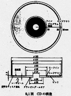 光ディスクメモリーと言えばCDである。CDの構造は下図の通りだ。一般的な物だと容量は650MB。フロッピーの500倍である。 ちなみに現在では700MBの物も量産されている。(どうやら倍密度1.3GBという大容量の物が登場するらしいですね)レーザー光線 をCDの下側から照射して記録膜で反射して下に戻り,これを検知して読み取る。CDは渦巻き状に記録トラックが走っていて,内側 からスタートして最外周に達すると終わる。(トラックの総延長は約5km。凄い。。。)