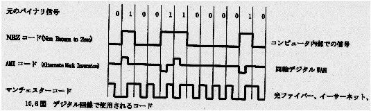 デジタル回線で使用されている信号形式(伝送コード)を下図に示す。AMIコードは0が続いても1が続いても電位的に 常に0を中心に維持しているので信号パターンによる直流成分が発生せず、長距離の伝送も安定して行える。 一方マンチェスターコードは常にビットの中心のタイミングで信号の変化がある。これは送信側のクロックを受信側が 過去に受信した信号の延長として拾い出すのに便利である。