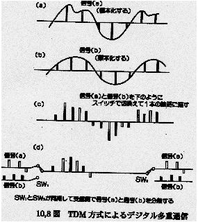 デジタル回線においても多重通信が行われる。その際に用いられるのがTDMという技術である。下図にあるように複数の 信号をスイッチでうまく切り換えて1本の線路に流して、受信側で分離する。図では2つの信号だけ表しているが、実際は 光ファイバーを用いて数千の信号を多重して伝送することが可能である。ちなみに光ファイバーは前回説明した同軸ケーブル の100倍の性能を持つ。