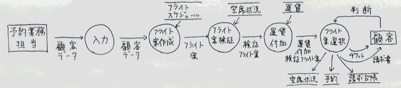 まず、客に名前・搭乗年月日などのデータ(以下、顧客データとする)を聞き、予約システムに入力する。予約システムはフライトデータベースにそのフライトが存在するかかどうかを調べる。もしなければ、前後の日を表示し、それでもなければ、フライトがないというエラーを予約システムに返す。あった場合、予約システムは通信回線を用いて、空席状況データベースによって空席があるかどうか調べる。そして、席があるもののみ、運賃データベースから運賃を調べ、フライト案に付加する。そのとき、エコノミー、ビジネス、ファーストのそれぞれの運賃を調べる。