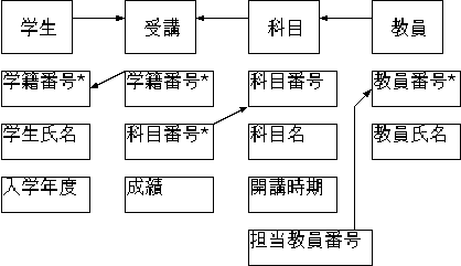 各々の実体レコード型の値である実体レコードが、学生、受講、科目、教員の各々の実体を反映され、また一意に識別されるように、属性を準備し、特に主キーとなる属性には、*印をつけ、以下のように図示する。
