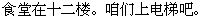 1)食堂は12階にあります。私達エレベーターで上りましょう。