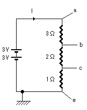 a点は良導体で、電源6Vに直結しているから、上記の計算をせずとも見ただけで6Vである ことは自明である。