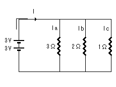 下図のように接続したとき、全体の電流I、およびla、lb、lcをそれぞれ求めよ。