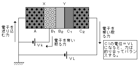 普通のコレクタにかける電圧(L)はベースにかける電圧(K)よりも高い。従ってベース/ コレクタの間では接合ダイオードに対して逆方向に電圧がかかる。その時ベースが分厚いと 下図のように接合Yで厚みのある空乏層B2,C1が出来る。 すると接合Xから侵入した電子がこの厚みを超えるための移動手段が無い。 (B2,C1に空き座席も玉突きも無い)