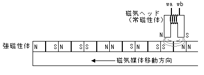 ヘッドの巻き腺には両方向に電流を流せることができ、下の強磁性体のNSの配置を変更することが できる。また、磁気ヘッドが移動する時には、移動時に強磁性体に影響が出ないように電流は ストップされる。