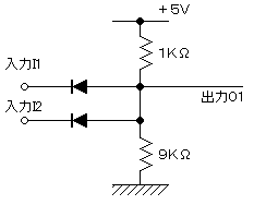 この図で、I1またはI2が電位0vならばO1 の電位は0.7vになる。(0.7vはダイオード順電位)