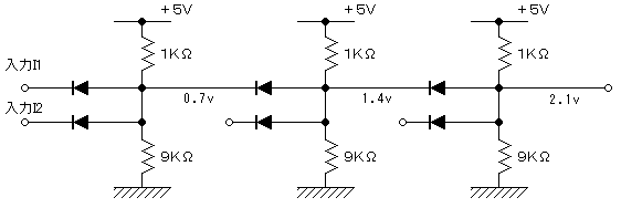 上図のように1段ごとにダイオード順電圧0.7vが累積していくから、3段目の 出力が2.1vになる。本来は0v論理”0”であってほしいところが2.1では 論理上”1”に弁別されてしまう。