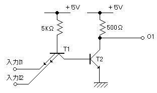 これがDTL(Diode Transistor Logic)の2入力NAND(NOT+AND)回路である。 実際には、独立のダイオードを個別に製作するよりは、半導体プロセスとしては5.4図 に示すようなエミッタが2個ある1つのトランジスタを製作するほうが容易なので、TTL (Transistor Transistor Logic)回路が使われている(回路説明は省略)