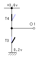 他の問題はFAN−Out制限である。出力端子O1の先に(他の出力の直結は 避けているとしても)あまりに多くのほかの入力端子が接続されると、T3が(エミッタ フォロワの限界に達し)3.6v一定値を維持できなくなる。普通は10個程度の入力が 接続されるのがほぼ正常限界である。このような時、MAX.Fan−Out=10と称する
