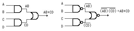 3NAND、4NANDか色は、入力部分のトランジスタT1のエミッタをマルチ化することで 実現される。AND回路、OR回路、NOR回路などは回路をすこし変形させることで得られるが、 NAND回路だけをうまく使ってAND、OR、NOTを全て代行実現でき、またそれが 効率的な実現手段でもある。普通の論理回路は、積和型と称して、AND+OR(OR+ANDでは ない)の形になることがほとんどである。この形をNAND回路だけを使って下図のように実現できる。