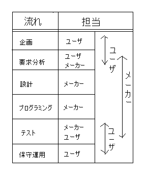 ・要求分析・・・・・・ユーザがどのような機能を求めているかを、ユーザとメーカーで話し合いを行い、メーカーで、きちんと把握し、目標を決める。