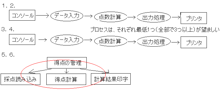 テストの点数結果を、計算、整理するプログラムを例に手順を追ってみよう。(番号は実行に則している)