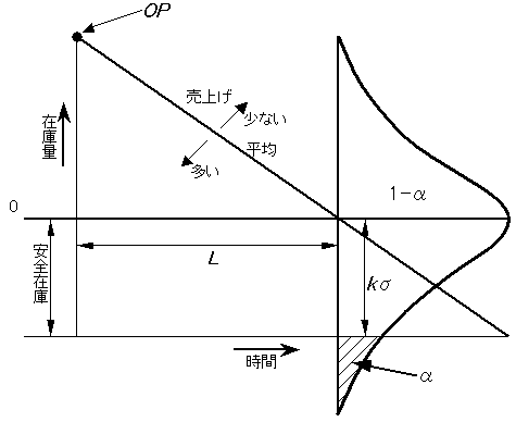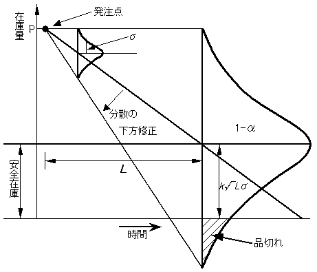 α(品切れ確率) 1% 2.5% 5% 10% k(安全係数) 2.33 1.96 1.65 1.28 たとえば、品切れ確率を1%にするには、kを2.33にするとよい。